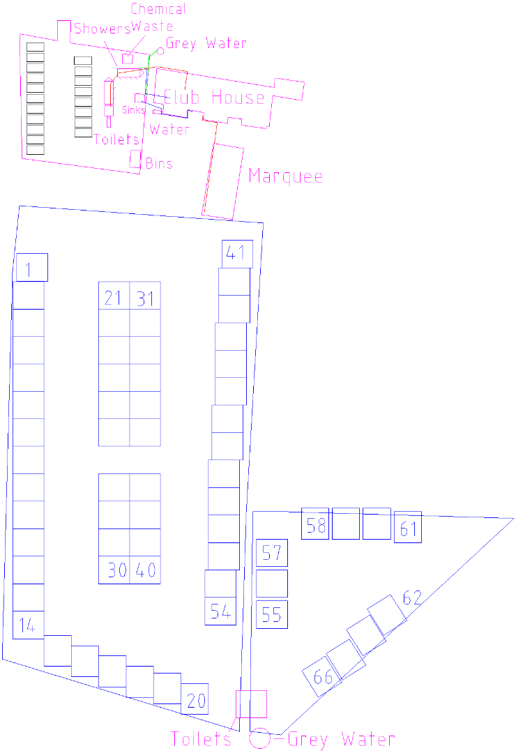 | Car parking | For those staying on site please park on the right hand side of your pitch as you look at it from the drive ways. For offsite people there is a small car park area for about 15 cars but please make sure plenty of room is left for emergency vehicles to the campsite and club house. Also we need to leave room for staff, caterers and the bands etc. There is some additional parking at a small car park a few hundred metre to the west of the site. |